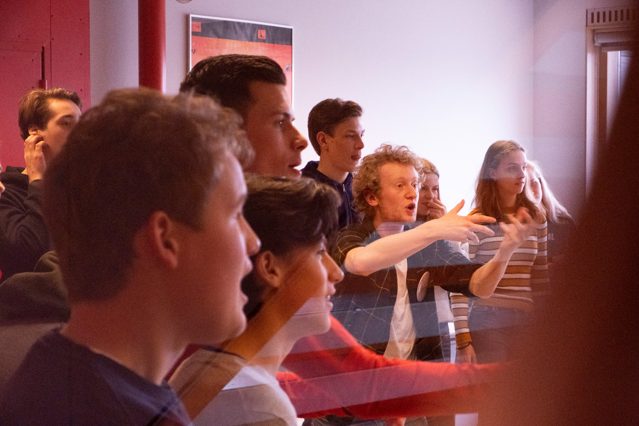 Dan verdelen we de studenten in groepen (van max. 125 of 100, afhankelijk van de voorstelling) en spelen we de voorstelling meerdere keren na elkaar. De tweede groep begint dan een uur later dan de eerste groep, etc.